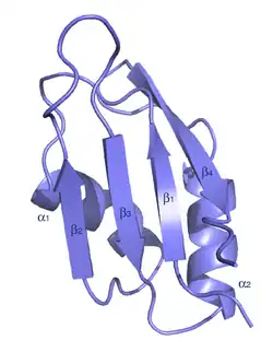 The typical RRM consists of four anti-parallel beta-strands and two alpha-helices arranged in a beta-alpha-beta-beta-alpha-beta fold with side chains that stack with RNA bases. A third helix is present during RNA binding in some cases.[7] The RRM is reviewed in a number of publications.[8][9][10]