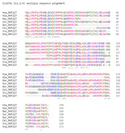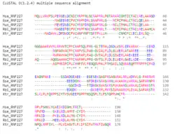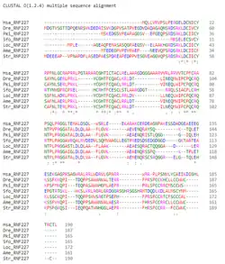 RING Finger Protein 227 has no paralogs. It does, however, have numerous orthologs extending throughout eukaryotes. The following table presents a selection of orthologs found using searches in BLAST[16] and BLAT.[17] This is not meant to be a comprehensive list, rather a small sample that shows the diversity of species in which orthologs are found.