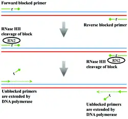 RNase H-dependent PCR (rhPCR)[1] is a modification of the standard PCR technique. In rhPCR, the primers are designed with a removable amplification block on the 3’ end. Amplification of the blocked primer is dependent on the cleavage activity of a hyperthermophilic archaeal Type II RNase H enzyme during hybridization to the complementary target sequence. This RNase H enzyme possesses several useful characteristics that enhance the PCR. First, it has very little enzymatic activity at low temperature, enabling a “hot start PCR” without modifications to the DNA polymerase. Second, the cleavage efficiency of the enzyme is reduced in the presence of mismatches near the RNA residue. This allows for reduced primer dimer formation,[1] detection of alternative splicing variants,[2][3] ability to perform multiplex PCR with higher numbers of PCR primers, and the ability to detect single-nucleotide polymorphisms.[4]