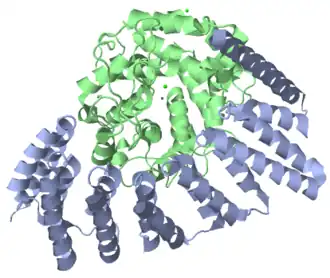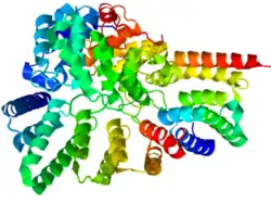 ![]() Crystallographic structure of rat RabGGTase (rainbow colored, N-terminus = blue, C-terminus = red).[1] | |||||||