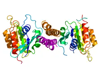 ![]() Crystallographic structure of the C-terminal Rabaptin5 domain homodimer (colored orange and magenta at the center of the figure) complexed with two independent molecules of the GTPase domain of RAB5A (rainbow colored, N-terminus = blue, C-terminus = red).[1] | |||||||||||