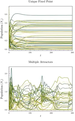 In the thermodynamic limit where there is an asymptotically large number of species (i.e., ), there are three distinct phases: one in which there is a unique fixed point (UFP), another with a multiple attractors (MA), and a third with unbounded growth. In the MA phase, depending on whether species abundances are replenished at a small rate, may approach arbitrarily small population sizes, or are removed from the community when the population falls below some cutoff, the resulting dynamics may be chaotic with persistent fluctuations or approach an initial conditions-dependent steady state.[1]