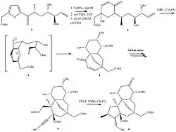 An alternative approach to synthesizing the three-ring backbone makes use of radical reactions to create the first and third rings in a single step, followed by the creation of the remaining ring. It has been proposed by the Masayuki Inoue group of the University of Tokyo.[11][12]