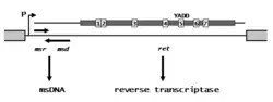 Retron elements are about 2 kb long. They contain a single operon controlling the synthesis of an RNA transcript carrying three loci, msr, msd, and ret, that are involved in msDNA synthesis. The DNA portion of msDNA is encoded by the msd gene, the RNA portion is encoded by the msr gene, while the product of the ret gene is a reverse transcriptase similar to the RTs produced by retroviruses and other types of retroelements.[1] Like other reverse transcriptases, the retron RT contains seven regions of conserved amino acids (labeled 1–7 in the figure), including a highly conserved tyr-ala-asp-asp (YADD) sequence associated with the catalytic core. The ret gene product is responsible for processing the msd/msr portion of the RNA transcript into msDNA.