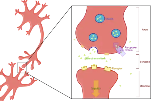 The main objective of a reuptake inhibitor is to substantially decrease the rate by which neurotransmitters are reabsorbed into the presynaptic neuron, increasing the concentration of neurotransmitter in the synapse. This increases neurotransmitter binding to pre- and postsynaptic neurotransmitter receptors.[9] Depending on the neuronal system in question, a reuptake inhibitor can have drastic effects on cognition and behavior. Non-competitive inhibition of the bacterial homologue LeuT by tricyclic antidepressants resulted from binding of these inhibitors in the extracellular permeation pathway.[10][11] However, the competitive nature of serotonin transport inhibition by antidepressants suggests that in neurotransmitter transporters, they bind in a site overlapping the substrate site.[12]