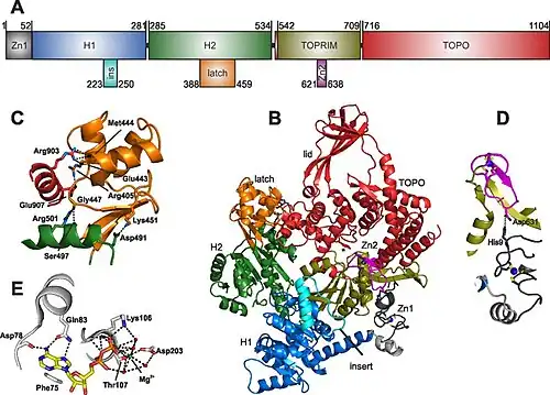 The latch domain appears to be variable across species, with domain size ranging from as small as 10 amino acids to as large as 120 amino acids.[12] The latch is thought to function as a control mechanism to prevent the topoisomerase domain from creating negative supercoils and relaxing the DNA, and instead allows the enzyme to create positive supercoils in an ATP-dependent manner during the strand passage step of the helicase domain.[5][17]