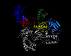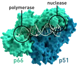 ![]() Crystallographic structure of HIV-1 reverse transcriptase where the two subunits p51 and p66 are colored and the active sites of polymerase and nuclease are highlighted.[1] | |||||||||