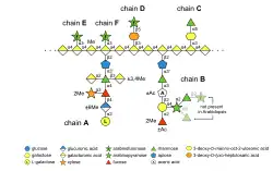 Rhamnogalacturonan-II (RG-II) is a complex polysaccharide component of pectin that is found in the primary cell walls of dicotyledonous and monocotyledonous plants and gymnosperms.[1] It is supposed to be crucial for the plant cell wall integrity. RG-II is also likely to be present in the walls of some lower plants (ferns, horsetails, and lycopods). Its global structure is conserved across vascular plants, albeit a number of variations within the RGII side chains have been observed between different plants.[2] RG-II is composed of 12 different glycosyl residues including D-rhamnose, D-apiose, D-galactose, L-galactose, Kdo, D-galacturonic acid, L-arabinose, D-xylose, and L-aceric acid, linked together by at least 21 distinct glycosidic linkages. Some resides are further modified via methylation and acetylation. It moreover supports borate mediated cross-linking between different RGII side-chain apiosyl residues. The backbone consists of a linear polymer of alpha-1,4-linked D-galactopyranosiduronic acid. RG-II can be isolated from different sources, such as apple juice and red wine.[3]