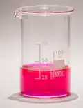 The solubility of rhodamine B in water varies by manufacturer, and has been reported as 8 g/L and ~15 g/L,[1] while solubility in alcohol (presumably ethanol) has been reported as 15 g/L.[nt 1] Chlorinated tap water decomposes rhodamine B. Rhodamine B solutions adsorb to plastics and should be kept in glass.[8] Rhodamine B is tunable around 610 nm when used as a laser dye.[9] Its luminescence quantum yield is 0.65 in basic ethanol,[10] 0.49 in ethanol,[11] 1.0,[12] and 0.68 in 94% ethanol.[13] The fluorescence yield is temperature dependent;[14] the compound is fluxional in that its excitability is in thermal equilibrium at room temperature.[15]