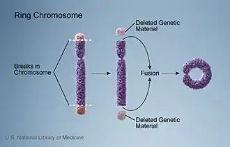 A ring chromosome is an aberrant chromosome whose ends have fused together to form a ring. Ring chromosomes were first discovered by Lilian Vaughan Morgan in 1926.[1] A ring chromosome is denoted by the symbol r in human genetics and R in Drosophila genetics. Ring chromosomes may form in cells following genetic damage by mutagens like radiation, but they may also arise spontaneously during development.