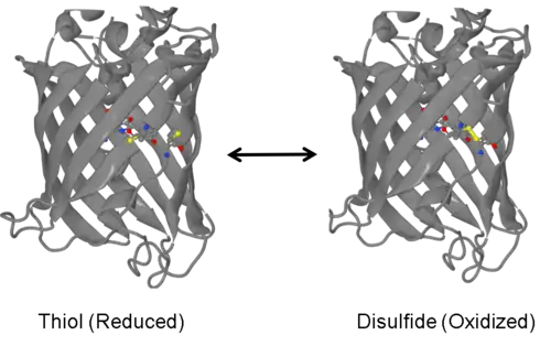 - ↑ Lohman JR, Remington SJ (August 2008). "Development of a family of redox-sensitive green fluorescent protein indicators for use in relatively oxidizing subcellular environments". Biochemistry. 47 (33): 8678–88. doi:10.1021/bi800498g. PMID 18652491.