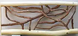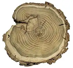 The wood is extremely hard, being one of the hardest woods in Northern America with a Janka hardness test of 1,700 lbf (7,560 N)[46] and specific gravity of 0.733 (733 kilograms per cubic metre or 45.7 pounds per cubic foot). It is very resistant to rot, and durable, making it prized for furniture, flooring, paneling, fence posts, and small watercraft. Black Locust is a highly durable organic wood product that does not require chemical treatment to preserve its beauty for 50 years or longer.[47] Wet, newly cut planks have an offensive odor which disappears with seasoning. Black locust is still in use in some rustic handrail systems. In the Netherlands and some other parts of Europe, black locust is one of the most rot-resistant local trees, and projects have started to limit the use of tropical wood by promoting this tree and creating plantations. Flavonoids in the heartwood allow the wood to last over 100 years in soil.[48]