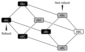 Being robust may even be a favoured at the expense of total fitness as an evolutionarily stable strategy (also called survival of the flattest).[52] A high but narrow peak of a fitness landscape confers high fitness but low robustness as most mutations lead to massive loss of fitness. High mutation rates may favour population of lower, but broader fitness peaks. More critical biological systems may also have greater selection for robustness as reductions in function are more damaging to fitness.[53] Mutational robustness is thought to be one driver for theoretical viral quasispecies formation.