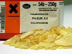 - ↑ "colophony". Oxford English Dictionary (Online ed.). Oxford University Press. (Subscription or participating institution membership required.) "ad. L. colophōnia (Pliny) for Colophōnia rēsīna resin of Colophon".