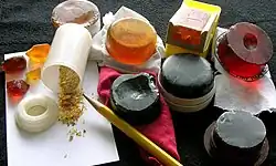 Players of bowed string instruments rub cakes or blocks of rosin on their bow hair so it can grip the strings and make them "speak", or vibrate clearly.[14] Occasionally, substances such as beeswax, gold, silver, tin, or meteoric iron[15] are added to the rosin to modify its stiction/friction properties and the tone that can be produced.[16] Powdered rosin can be applied to new hair, for example with a felt pad or cloth, to reduce the time taken in getting sufficient rosin onto the hair. Rosin is often reapplied immediately before playing the instrument. Lighter rosin is generally preferred for violins and violas, and in high-humidity climates, while darker rosins are preferred for cellos, and for players in cool, dry areas.[17] There are also specific, distinguishing types for basses.