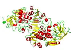 The Rossmann fold is a tertiary fold found in proteins that bind nucleotides, such as enzyme cofactors FAD, NAD+, and NADP+. This fold is composed of alternating beta strands and alpha helical segments where the beta strands are hydrogen bonded to each other forming an extended beta sheet and the alpha helices surround both faces of the sheet to produce a three-layered sandwich. The classical Rossmann fold contains six beta strands whereas Rossmann-like folds, sometimes referred to as Rossmannoid folds, contain only five strands. The initial beta-alpha-beta (bab) fold is the most conserved segment of the Rossmann fold.[1] The motif is named after Michael Rossmann who first noticed this structural motif in the enzyme lactate dehydrogenase in 1970 and who later observed that this was a frequently occurring motif in nucleotide binding proteins.[2]