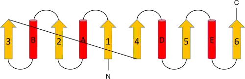 The Rossmann fold is composed of six parallel beta strands that form an extended beta sheet. The first three strands are connected by α- helices resulting in a beta-alpha-beta-alpha-beta structure. This pattern is duplicated once to produce an inverted tandem repeat containing six strands. Overall, the strands are arranged in the order of 321456 (1 = N-terminal, 6 = C-terminal).[9] Five stranded Rossmann-like folds are arranged in the order 32145.[10] The overall tertiary structure of the fold resembles a three-layered sandwich wherein the filling is composed of an extended beta sheet and the two slices of bread are formed by the connecting parallel alpha-helices.[1]
