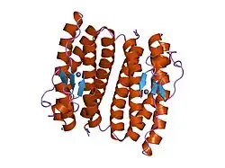 - ↑ deMaré, Fredrick; Kurtz, Donald M.; Nordlund, Pär (June 1996). "The structure of Desulfovibrio vulgaris rubrerythrin reveals a unique combination of rubredoxin-like FeS4 and ferritin-like diiron domains". Nature Structural & Molecular Biology. 3 (6): 539–546. doi:10.1038/nsb0696-539. ISSN 1545-9993. PMID 8646540. S2CID 21142700.