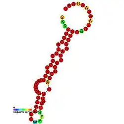 The RydB RNA is a non-coding RNA originally identified in E. coli in an RNA screen.[1] This gene is only 67 nucleotides in length and is composed of a hairpin like structure. RydB lies between the ydiC and ydiH in E. coli. Homologous RNA genes have been found in other species such as Shigella flexneri and Salmonella species. The molecular function of this RNA is unknown.[1]