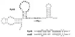 RyhB RNA levels are inversely correlated with mRNA levels for the sdhCDAB operon, encoding succinate dehydrogenase, as well as five other genes previously shown to be positively regulated by Fur by an unknown mechanism. These include two other genes encoding enzymes in the tricarboxylic acid cycle, acnA and fumA, two ferritin genes, ftnA and bfr, and a gene for superoxide dismutase, sodB.[4] A number of other genes have been predicted computationally and verified as targets by microarray analysis: napF, sodA, cysE, yciS, acpS, nagZ and dadA.[1] RyhB is bound by the Hfq protein, that increases its interaction with its target messages.