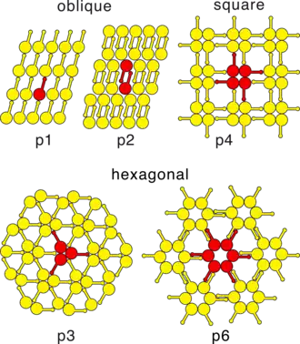 In general, S-layers exhibit either oblique (p1, p2), square (p4) or hexagonal (p3, p6) lattice symmetry. Depending on the lattice symmetry, each morphological unit of the S-layer is composed of one (p1), two (p2), three (p3), four (p4), or six (p6) identical protein subunits. The center-to-center spacing (or unit cell dimensions) between these subunits range from 4 to 35 nm.[2][3][7]