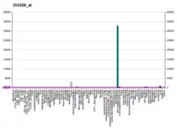 Its expression is reduced in many types of cancer, thereby distinguishing the cancerous expression profile of the other proteins of the S100 group.[15][16][17] It has been reported that S100A2 is downregulated in lung, kidney, prostate cancer and melanoma.[15] Chromosomal rearrangements and altered expression of this gene have also been implicated in breast cancer.[18][17][7] In addition, its decline is associated with poor prognosis, disease progression, increased occurrence of metastasis and increased patient mortality.[19] Although in most cancers it has been found in reduced levels, there are studies that show that in some cases it is overproduced.[20][21]