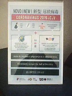 Severe acute respiratory syndrome coronavirus 2 (SARS‑CoV‑2)[2] is a strain of coronavirus that causes COVID-19, the respiratory illness responsible for the COVID-19 pandemic.[3] The virus previously had the provisional name 2019 novel coronavirus (2019-nCoV),[4][5][6][7] and has also been called human coronavirus 2019 (HCoV-19 or hCoV-19).[8][9][10][11] First identified in the city of Wuhan, Hubei, China, the World Health Organization designated the outbreak a public health emergency of international concern from January 30, 2020, to May 5, 2023.[12][13][14] SARS‑CoV‑2 is a positive-sense single-stranded RNA virus[15] that is contagious in humans.[16]