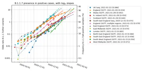 On 18 December 2020—early on in the risk assessment of the variant—the UK scientific advisory body New and Emerging Respiratory Virus Threats Advisory Group (NERVTAG) concluded that they had moderate confidence that VOC-202012/01 was substantially more transmissible than other variants, but that there were insufficient data to reach any conclusion on underlying mechanism of increased transmissibility (e.g. increased viral load, tissue distribution of virus replication, serial interval etc.), the age distribution of cases, or disease severity.[29] Data seen by NERVTAG indicated that the relative reproduction number ("multiplicative advantage") was determined to be 1.74—i.e., the variant is 74% more transmissible—assuming a 6.5-day generational interval. It was demonstrated that the variant grew fast exponentially with respect to the other variants.[43][44][45] The variant out-competed the ancestral variant by a factor of every two weeks. Another group came to similar conclusions, generating a replicative advantage, independent of "protective measures", of 2.24 per generation of 6.73 days, out-competing the ancestral variant by every two weeks.[46] Similarly, in Ireland, the variant—as indicated by the missing S gene[c] detection (S-gene target failure [SGTF]), which historically was rare—went from 16.3% to 46.3% of cases in two weeks. This demonstrates, based on the statistics of 116 positive samples, that the variant had a relative higher growth by a factor of , when compared to the average growth for all other variants by the end of this two week period.[48] The variant became the dominant variant in London, East of England and the South East from low levels in one to two months. A surge of SARS-CoV-2 infections around the start of the new year was the result of the elevated transmissibility of the variant, while the other variants were in decline.[49][50][51]