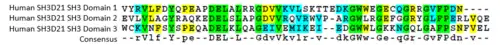 SH3D21 is a nuclear protein that is encoded by the SH3D21 gene. In humans, this gene is located on chromosome 1 p34.3.[5] The human mRNA transcript is 2527 base pairs and the final protein product is 756 amino acids.[6] While the exact function of this protein remains unknown, due to the presence of three SH3 domains, it has been implicated in protein-protein interactions.[7]