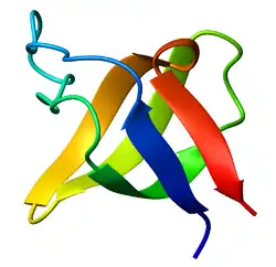 ![]() Ribbon diagram of the SH3 domain, alpha spectrin, from chicken (PDB accession code 1SHG), colored from blue (N-terminus) to red (C-terminus). | |||||||||