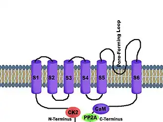 SK potassium channels share the same basic architecture with Shaker-like voltage-gated potassium channels.[9] Four subunits associate to form a tetramer. Each of the subunits has six transmembrane hydrophobic alpha helical domains (S1-S6). A loop between S5 and S6—called the P-loop—provides the pore-forming region that always faces the center of the channel.[10] Each of the subunits has six hydrophobic alpha helical domains that insert into the cell membrane. A loop between the fifth and sixth transmembrane domains forms the potassium ion selectivity filter. SK channels may assemble as homotetrameric channels or as heterotetrameric channels, consisting of more than one SK channel subtype. In addition, SK potassium channels are tightly associated with the protein calmodulin, which accounts for the calcium sensitivity of these channels.[9][11] Calmodulin participates as a subunit of the channel itself, bound to the cytoplasmic C-terminus region of the peptide called the calmodulin binding domain (CaMBD).[12]