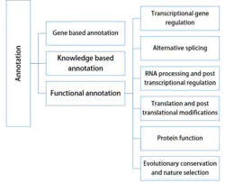 Knowledge base annotation is done based on the information of gene attribute, protein function and its metabolism. In this type of annotation more emphasis is given to genetic variation that disrupts the protein function domain, protein-protein interaction and biological pathway. The non-coding region of genome contain many important regulatory elements including promoter, enhancer and insulator, any kind of change in this regulatory region can change the functionality of that protein.[9] The mutation in DNA can change the RNA sequence and then influence the RNA secondary structure, RNA binding protein recognition and miRNA binding activity.[10][11]