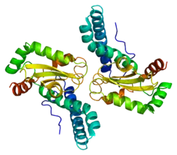 Superoxide dismutase 2, mitochondrial (SOD2), also known as manganese-dependent superoxide dismutase (MnSOD), is an enzyme which in humans is encoded by the SOD2 gene on chromosome 6.[5][6] A related pseudogene has been identified on chromosome 1. Alternative splicing of this gene results in multiple transcript variants.[5] This gene is a member of the iron/manganese superoxide dismutase family. It encodes a mitochondrial protein that forms a homotetramer and binds one manganese ion per subunit. This protein binds to the superoxide byproducts of oxidative phosphorylation and converts them to hydrogen peroxide and diatomic oxygen. Mutations in this gene have been associated with idiopathic cardiomyopathy (IDC), premature aging, sporadic motor neuron disease, and cancer.[5]