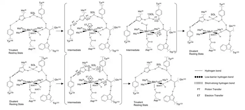 The protons of the active site have been directly visualized and revealed that SOD2 utilizes a series of proton transfers among its active site residues per electron transfer step.[9] The findings demonstrate the use of unusual chemistry by the enzyme that include a glutamine that is cyclically deprotonated and protonated and amino acids with pKas that are significantly different from expected values. Low-barrier and short-strong hydrogen bonds are seen contributing to catalysis by promoting proton transfers and stabilizing intermediates in a fashion similar to those of some catalytic Asp-Ser-His triads.[10]