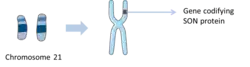 SON is the name that has been given to a large Ser/Arg (SR)-related protein, which is a splicing co-factor that contributes to an efficient splicing within cell cycle progression.[7] It is also known as BASS1 (Bax antagonist selected in saccharomyces 1) or NRE-binding protein (Negative regulatory element-binding protein). The most common gene name of this splicing protein is SON, but C21orf50, DBP5, KIAA1019 and NREBP can also be used as synonyms.[8]