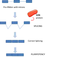 Human embryonic stem cells are able to undergo the process of differentiation into specific and relevant cells. To maintain the pluripotency of the embryonic stem cells, transcription factors and epigenetic modifiers play an important role despite the fact that little is known about the regulation of pluripotency throughout the process of splicing. The factor SON is identified as essential for the maintenance of this pluripotency. It is confirmed that SON regulates the splicing process of transcripts (RNAm) that will encode the gens that are going to regulate the pluripotency of the embryonic human cells.[14]