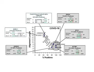 Using PHI-BLAST and a sequence pattern (e.g. L[RK]GG) a shorter list of host targets could be obtained; however, the searches still produced hundreds of host targets (YouTube Video). To sort them and rank order them Legler used clustering. Plotting 'percent positives' vs. 'alignment length' from the PHI-BLAST output file, the cleavable proteins were found to cluster and localize to the right of the graph.[8] The hit lists could now be sorted by alignment length and percent positives and a rank-ordered list could be produced. At the top of the list are the most likely substrates and at the bottom the less likely substrates. This and experimental data[9][10][11][1] became the basis for the first sequence-to-symptom software for viruses.[8] An example of the software output can be found here.