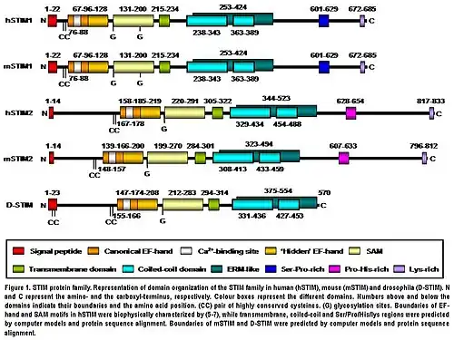 STIM2 protein is a type I transmembrane protein located in the S/ER. Human STIM2 consists of 833 amino acid residues (aas) (105-115 kDa) (Fig. 1), 148 additional aas compared to human STIM1. Their N-terminal regions share 66% similarity over 577 aas (85% of the amino acid sequence of STIM1). Only the extreme of the C-terminal region shows a significant sequence divergence. The domain architecture of both isoforms is highly conserved in vertebrates (Fig. 1). Mouse STIM2 shares a 92% identity with human STIM2 in the aminoacid sequence according to the pairwise alignment generated by BLAST. Their domain structure is also highly conserved (Fig. 1). Human STIM2 is post-translationally modified in vivo, such as maturation by cleavage of N-terminal S/ER signaling peptide (14 aas), glycosylation and variable degrees of phosphorylation, but the phosphorylated sites are still unknown (Fig. 1).[5]