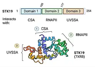STK19 contains 3 different protein-interaction domains, which are essential to its function in DNA repair: the CSA interacting domain, RNA Polymerase II (RNAPII) interacting domain, and UVSSA interacting domain.[9] These domains allow STK19 to incorporate into the Transcription-Coupled DNA Repair (TCR) complex, which is recruited to RNA Polymerase II stalled at DNA lesions.[9]