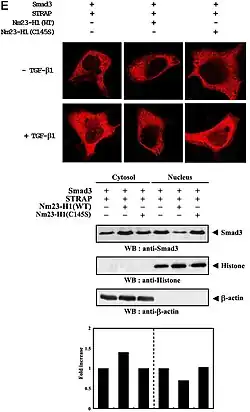 - ↑ Seong HA, Jung H, Ha H (April 2007). "NM23-H1 tumor suppressor physically interacts with serine-threonine kinase receptor-associated protein, a transforming growth factor-beta (TGF-beta) receptor-interacting protein, and negatively regulates TGF-beta signaling". The Journal of Biological Chemistry. 282 (16): 12075–12096. doi:10.1074/jbc.m609832200. PMID 17314099.