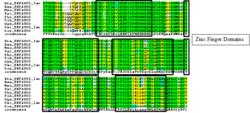 The ZNF280D protein is 979 amino acids in length.[11] The protein contains a domain of unknown function (DUF4195) spanning from amino acid 45 to amino acid 230.[11] DUF4195 (pfam13826) is a family that is found at the N-terminus of metazoan proteins that carry PHD-like zinc-finger domains; the function is unknown.[12] ZNF280D protein also contains five highly conserved Cys2His2-type zinc finger domains.[13] Zinc fingers have the ability to bind DNA, which supports the speculative role of ZNF280D as a transcription factor.[14] The protein has a weight of approximately 109.3 kdal.[15] Charge cluster analysis reveals a negative charge cluster near the N-terminus from amino acids 16-43.[15] Charge clusters are associated with functional domains of cellular transcription factors, providing further support for ZNF280D as a possible transcription factor.[16]