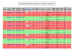 There are a number of SNPs that have been observed in the human population.[20] The image below lists some of the most frequently occurring.