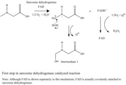 the first step of the reaction might involve the transfer of a hydride on the N-methyl group of sarcosine onto FAD, allowing H2O to attack the carbocation in order to form intermediate 1 (See figure 1). There is no deamination step. Instead, the demethylation of the N-methyl group on sarcosine occurs directly.[6] The reduced FADH− from the first step then is oxidized by O2 to form H2O2.[5]