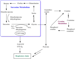 Sarcosine dehydrogenase is one of the enzymes in sarcosine metabolism, which catalyzes the demethylation of sarcosine to make glycine. It is preceded by dimethylglycine dehydrogenase which turns dimethylglycine into sarcosine. Glycine can also be turned into sarcosine by glycine N-methyltransferase.[13] Since glycine is the production of sarcosine dehydrogenase catalyzed reaction, aside from sarcosine metabolism, the enzyme is also indirectly connected to the creatine cycle and the respiratory chain in the mitochondria [14][15][16] (See figure 4 for pathway). Even so, the biological significance of sarcosine dehydrogenase beyond sarcosine metabolism is not entirely known. In a study of hereditary hemochromatosis using both wild type and HFE (gene) deficient mice fed with 2 percent carbonyl iron supplemented diet, sarcosine dehydrogenase was shown to be down-regulated in HFE deficient mice, but role sarcosine dehydrogenase in iron metabolism is unknown from the experiment conducted.[17]