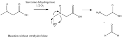 The demethylation of sarcosine catalyzed by sarcosine dehydrogenase can proceed with or without the presence of tetrahydrofolate.[11] Under anaerobic condition and without tetrahydrofolate, however, a free formaldehyde is formed after the N-demethylation of sarcosine.[12] The reaction with 1 mole of sarcosine and 1 mole of FAD, under this condition, yields 1 mole of glycine and 1 mole of formaldehyde (See figure 2 for mechanism).[9]