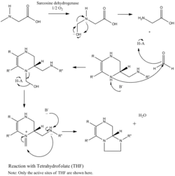 Under the presence of tetrahydrofolate, sarcosine dehydrogenase binds to tetrahydrofolate and convert tetrahydrofolate to 5,10-methylenetetrahydrofolate. Tetrahydrofolate here serves as a 1-carbon acceptor during the demethylation process (See figure 3 for mechanism).[2]
