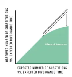 It is possible to estimate the amount of saturation that a sequence might have undergone by estimating the substitution rate of a genetic sequence and how much time has passed since divergence. Divergence rates are estimated from a variety of sources including ancestral DNA, fossil records and biographical events.[6] This use of molecular clocks to determine divergence is controversial because of its potential for inaccuracy and assumptions made in the model (such as consistent mutation rate for all branches) and is used mostly as an estimation tool.[6] Genetic saturation can also be estimated by comparing the number of observed differences in nucleotide sequences between multiple pairs of species. The number of observed substitutions between sequences of different species can be compared to the number of inferred substitutions based on branch length to find the approximate point where the number of inferred substitutions surpasses the number of observed substitutions.[6][7] This method can give researchers an idea of the level of saturation of a particular gene but is thought to underestimate the amount of saturation, especially for very large branch lengths.[2]