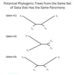 Parsimony plays a fundamental role in genetic saturation analysis. This principle gives preference to the simplest explanation that can explain the data. In regards to genetic saturation, parsimony means that the hypothesized relationship is one that has the smallest number of character changes. Using parsimony to analyze genetic saturation can lead to conflict when creating a phylogenetic tree.[7] When only sequence data is used, it is possible to come up with numerous phylogenetic trees with the same amount of parsimony.