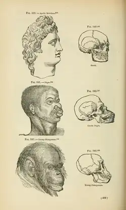 The Negro race ... is marked by black complexion, crisped or woolly hair, compressed cranium, and a flat nose. The projection of the lower parts of the face, and the thick lips, evidently approximate it to the monkey tribe: the hordes of which it consists have always remained in the most complete state of barbarism.