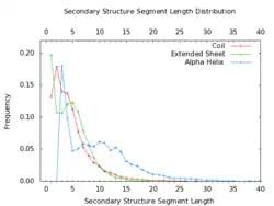 Protein secondary structure is the local spatial conformation of the polypeptide backbone excluding the side chains.[1] The two most common secondary structural elements are alpha helices and beta sheets, though beta turns and omega loops occur as well. Secondary structure elements typically spontaneously form as an intermediate before the protein folds into its three dimensional tertiary structure.